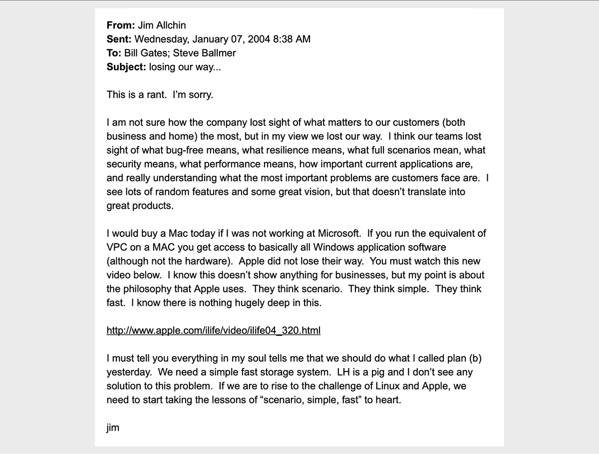 В 2004 году Джим Оллчин написал Биллу Гейтсу и Стиву Баллмеру письмо, в котором раскритиковал Windows и объяснил преимущество Apple.