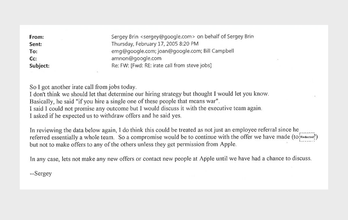 2005 год, Сергей Брин пишет письмо главе отдела по найму сотрудников после того, как ему позвонил Стив Джобс и яростно накричал в трубку. Причиной тому стали поступающие предложения сотрудникам Apple по устройству на работу в Google.