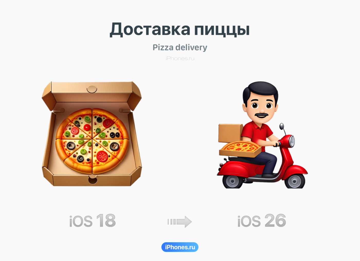 Для этого запроса пришлось собрать сразу четыре эмодзи (📦🛵🍕👨🏻) в iOS 26, но даже с ними получилось неидеально. А такой аппетитной коробки с пиццей, как в iOS 18, вообще не вышло.