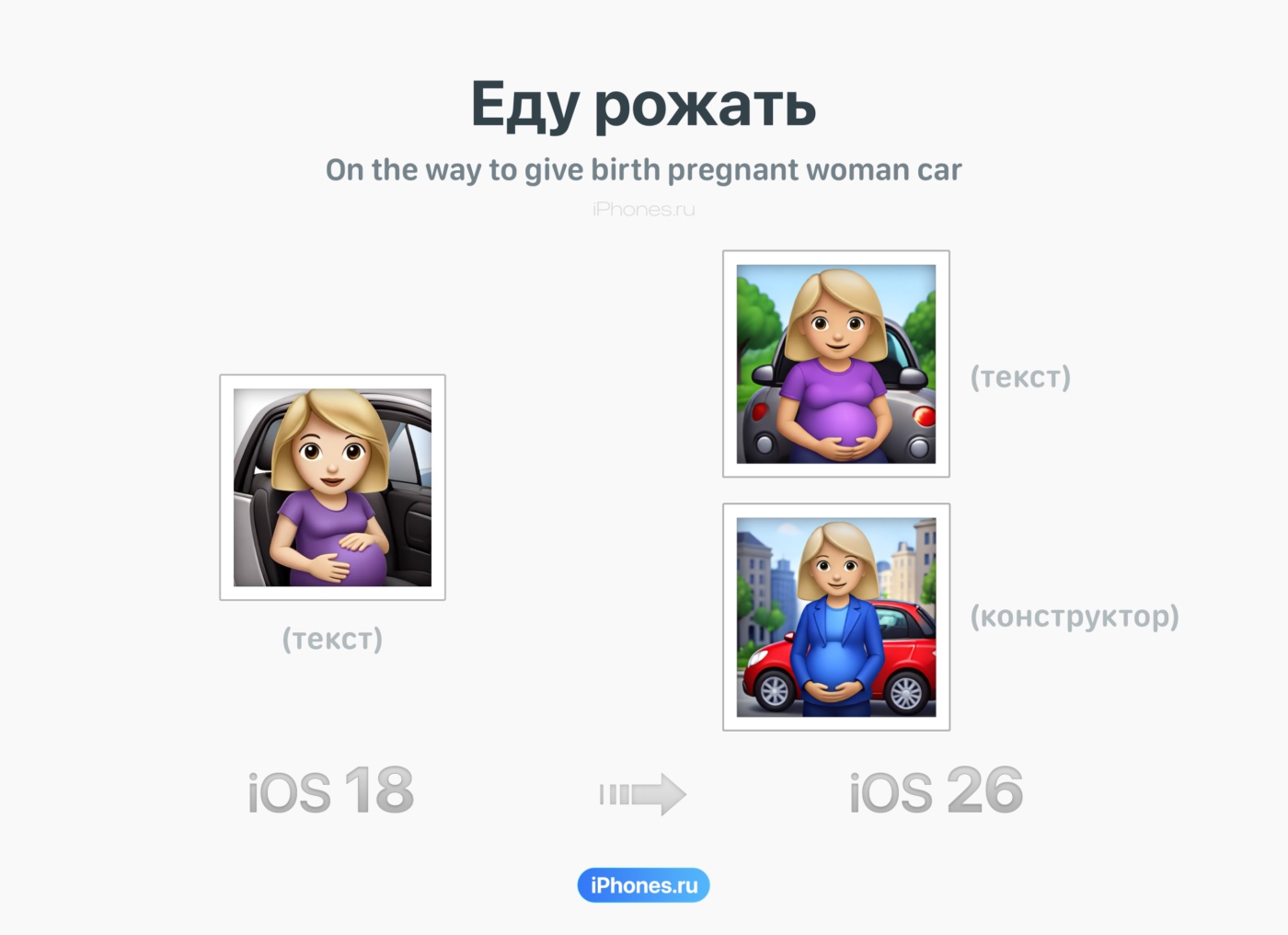 В iOS 18 получилось сделать девушку, которая уже сидит в авто, а в iOS 26 текстовый запрос выдавал такую перспективу, будто это авто гонится за беременной. С помощью конструктора (🤰+🚗) получилось адекватно.