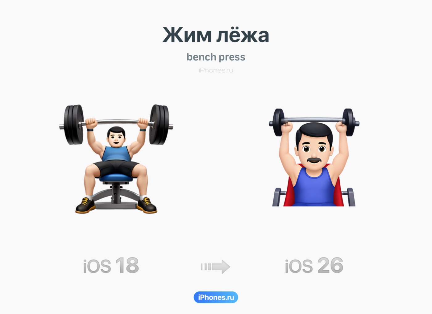 Сколько бы я не пробовал, iOS 26 так и не смогла сделать эмодзи с правильным положением персонажа при жиме лёжа. В iOS 18 тоже не совсем то, но хотя бы хват выглядит как настоящий.