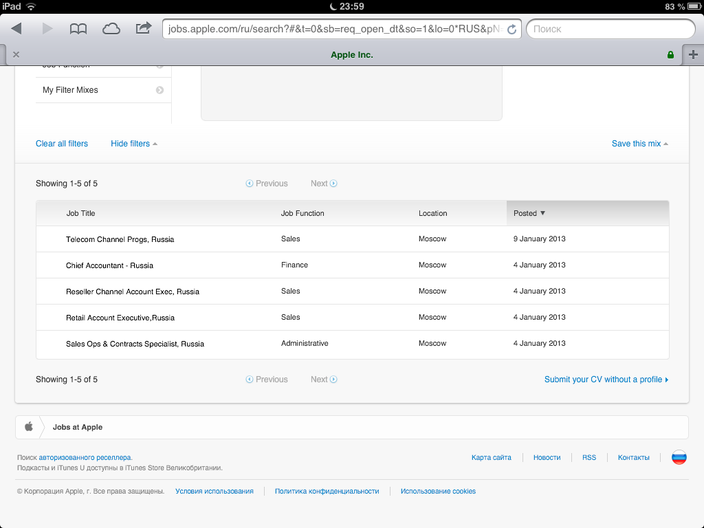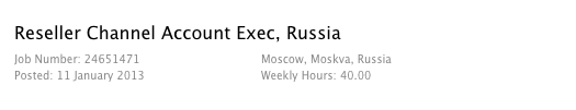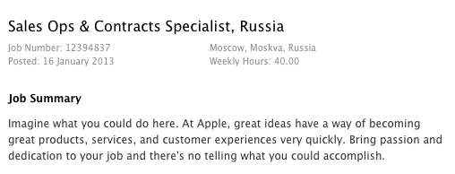 На страничке Apple в разделе «Работа» на этой неделе появились четыре московские вакансии: Telecom Channel Progs, Sales Ops & Contracts Specialist, Chief Accountant, Reseller Channel Account Exec.