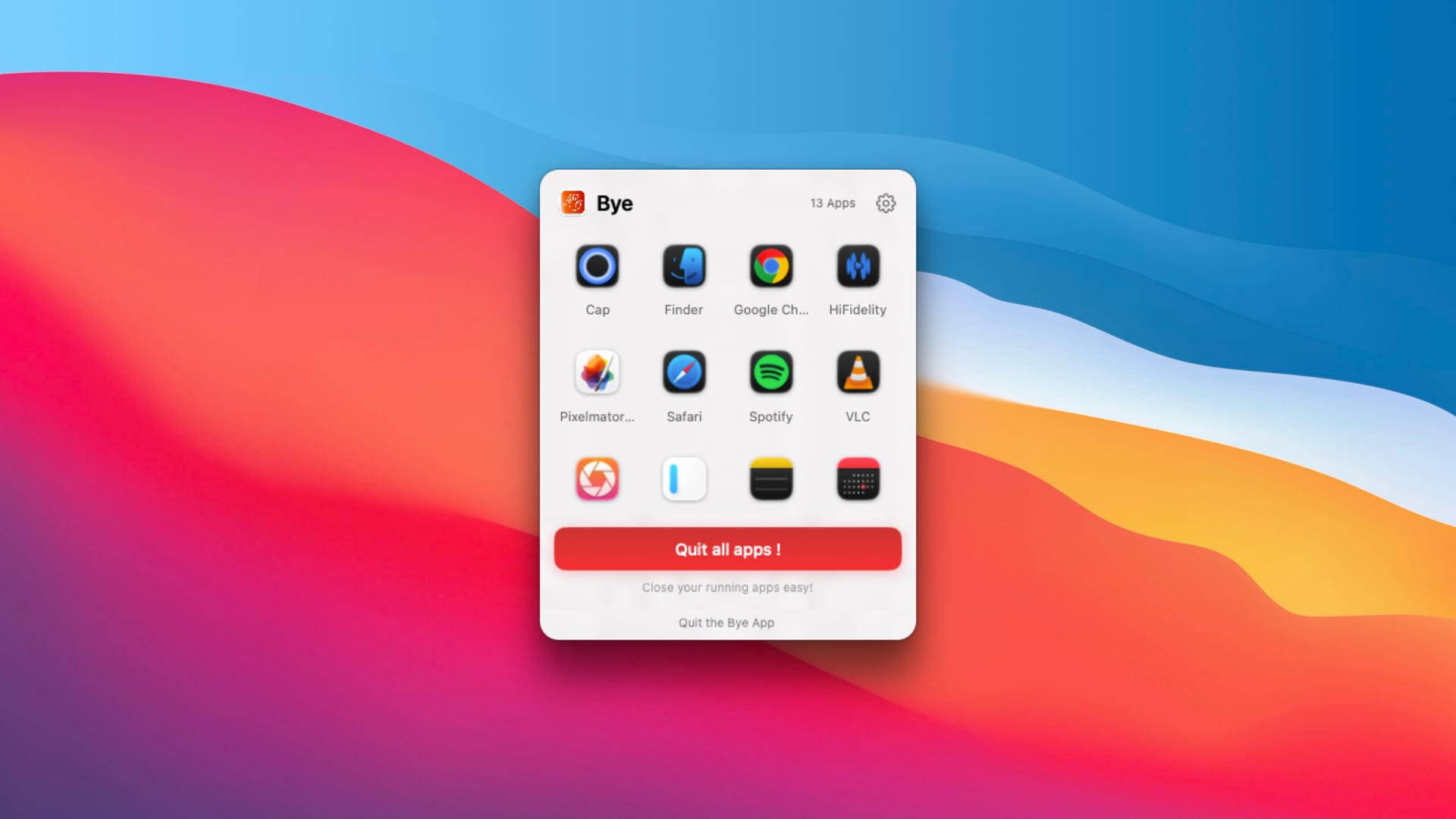 Bye — это кнопка «выхода», которая позволяет мгновенно завершить работу всех запущенных программ. Кликаем по значку приложения в строке меню и жмем красную кнопку Quit all apps, а затем закрываем крышку ноута и идем чилить.