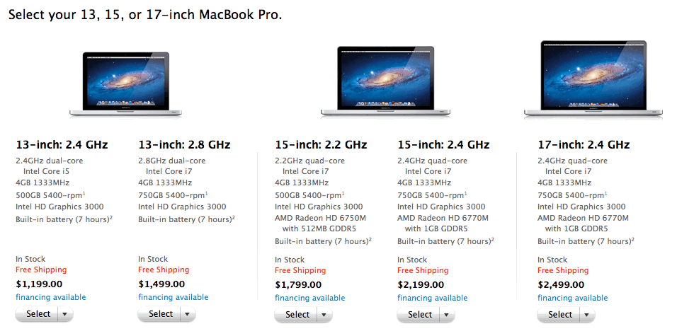 17-дюймовый монстр имеет на борту процессор Core i7 на 2,4 гигагерца, те же самые 4 гигабайта RAM и видеокарту Radeon 6770M на 1 гигабайт. Время автономной работы не изменилось. Дизайн остался прежним, как и цена. Забавно, но, согласно спецификациям, поддержки Bluetooth 4.0 нет ни в одной из моделей. Конфигурации built-to-order включают в себя возможность увеличить объёмы HDD, равно как заменить их на SSD-накопители. Для топовой 15- и 17-дюймовой модели доступна замена процессора на Core i7 2.5 ГГц.