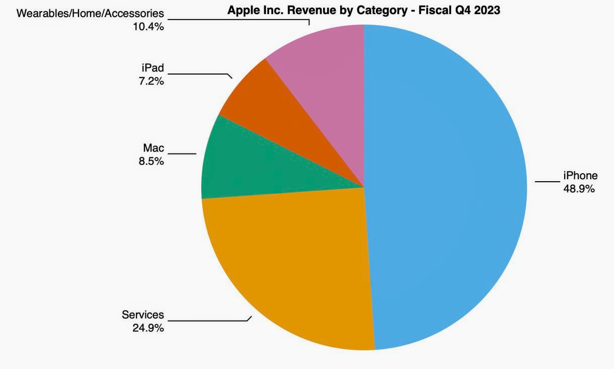 В этом квартале Apple установила рекорд по выручке от iPhone. Продажи iPhone принесли компании $43,8 млрд, что на 3% больше, чем за аналогичный период в прошлом году. Это также первый квартал, в котором учитываются продажи iPhone 15 и 15 Pro.