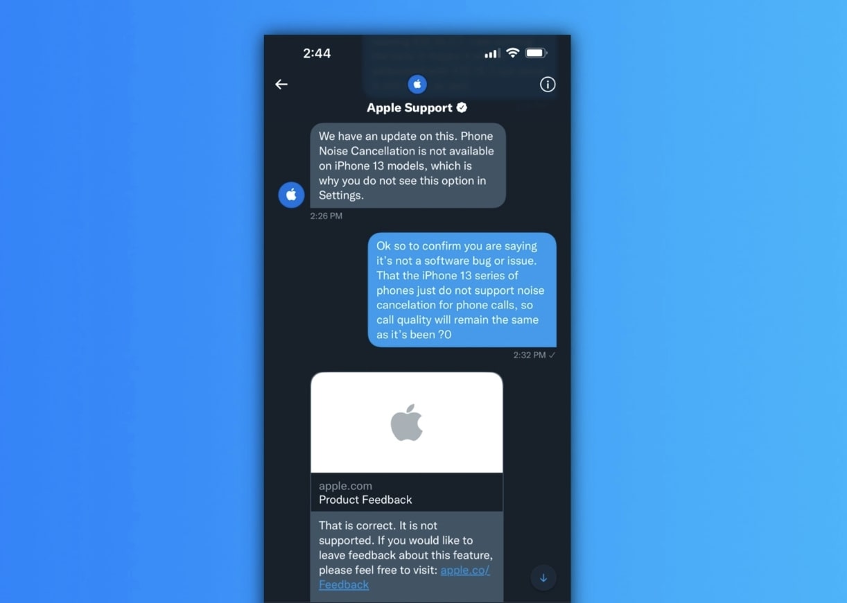 Но судя по последним сообщениям от поддержки Apple, которые опубликовал 9to5Mac, компания не планирует это делать. На вопрос читателя портала о том, почему в настройках нет параметра «Шумоподавление телефона», поддержка ответила: