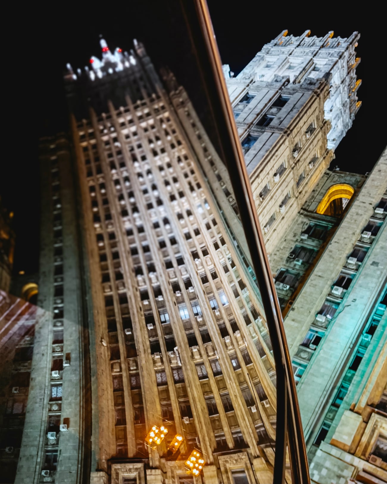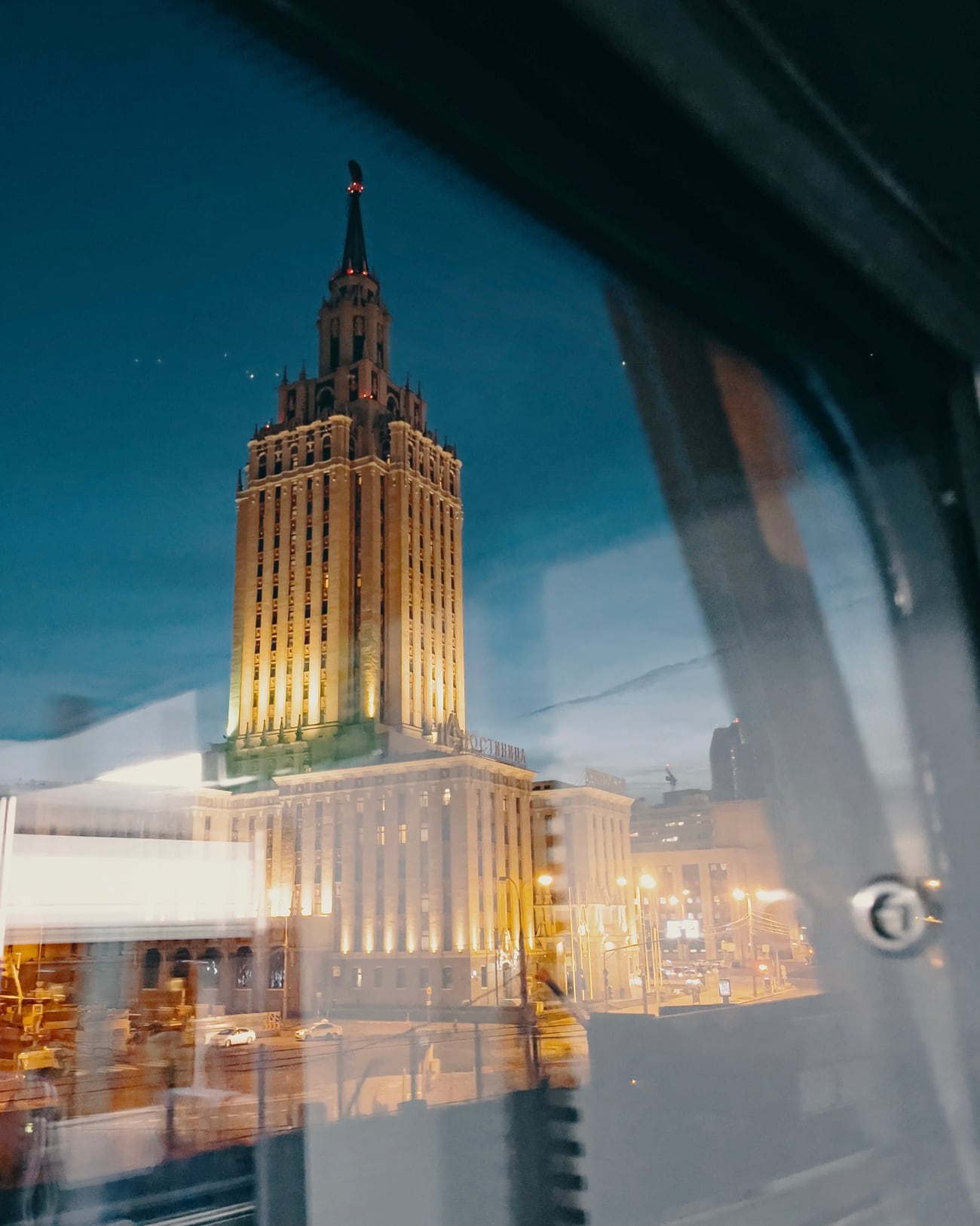 Абстрактный снимок гостиницы «Украина», на котором отель изображен ярким ночным маяком. Я стремился показать это здание с другой точки, непривычной для большинства. Съемка велась из Центра Международной Торговли. Мне хотелось, чтобы каждый кадр заставлял сомневаться в точке съёмки или немного подумать над тем, как получился этот снимок. Здесь вы видите это здание так, как скорее всего не видели его никогда. Драматичная подсветка создаёт ощущение, будто находишься в театре с красными бархатными занавесками, и вот-вот мы увидим главного героя.