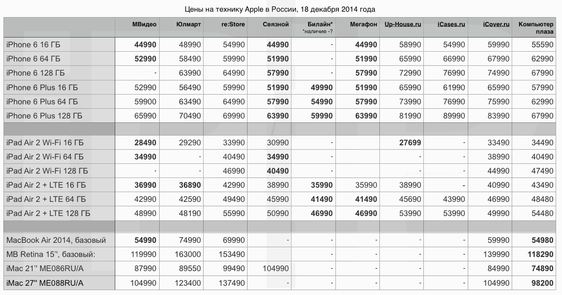 Хотите «сэкономить» на айфоне перед Новым годом или просто узнать, что изменилось после падения рубля? Держите нашу таблицу – пульс цен на технику Apple за 18 декабря. Пока магазины играются с числами и прогнозами, мы попробовали собрать факты.