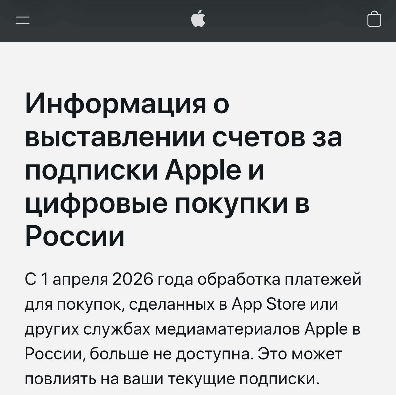 Apple сообщила на сайте поддержки, что с 1 апреля 2026 года в России полностью перестала работать обработка платежей для покупок и подписок в App Store и других цифровых сервисах компании.