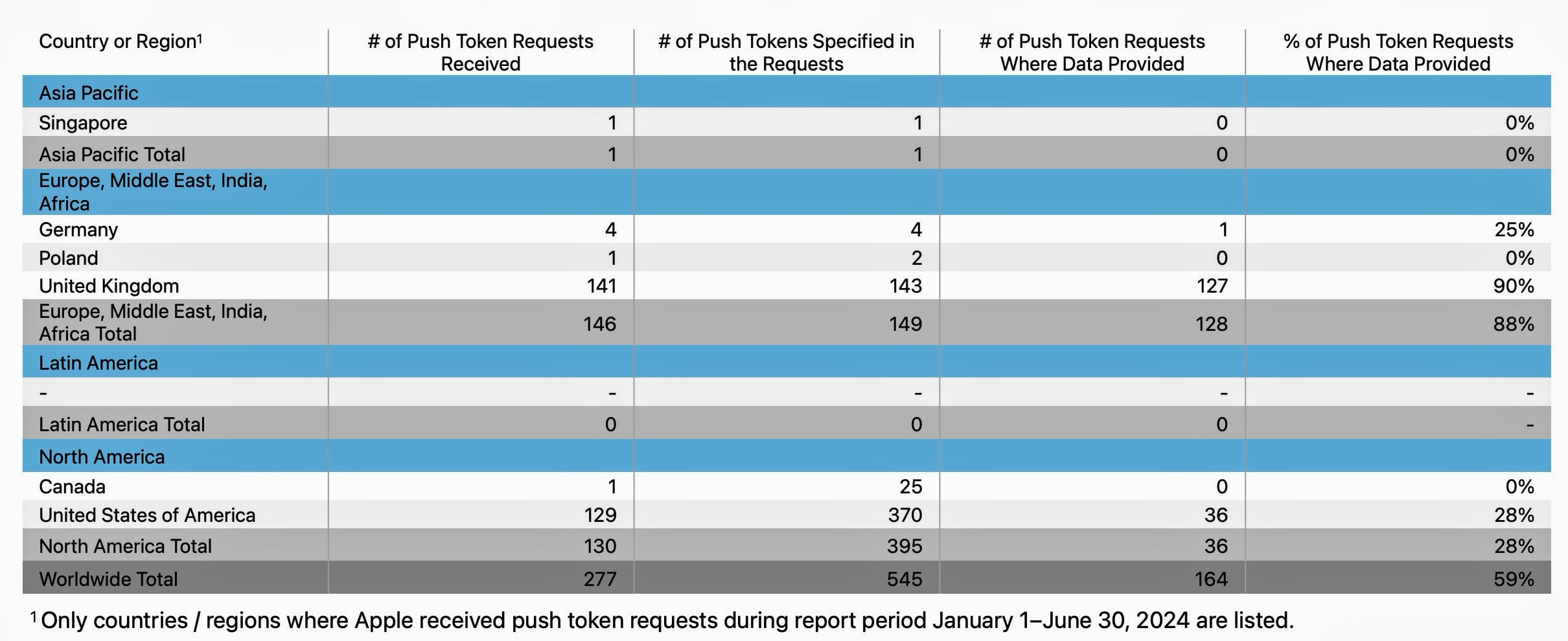 Интересно, что во второй половине 2023 года Израиль направил Apple один запрос, но он касался 694 push-токенов. Apple не ответила на него.