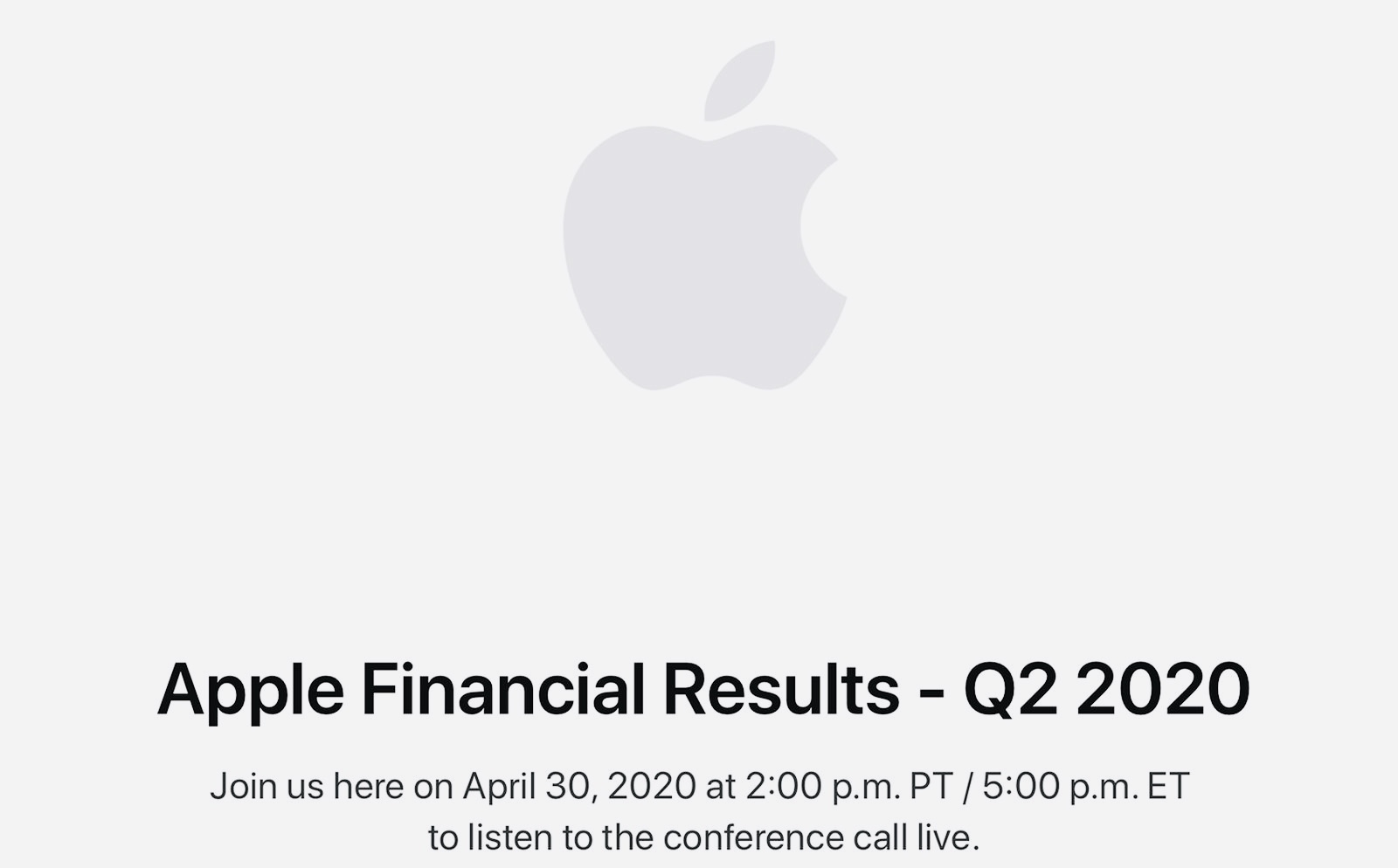 Apple обновила сайт и сообщила, что в 14:00 30-го апреля по Тихоокенскому времени (полночь 1 мая по московскому времени) расскажет об итогах второго финансового (первого календарного) квартала 2020 года.