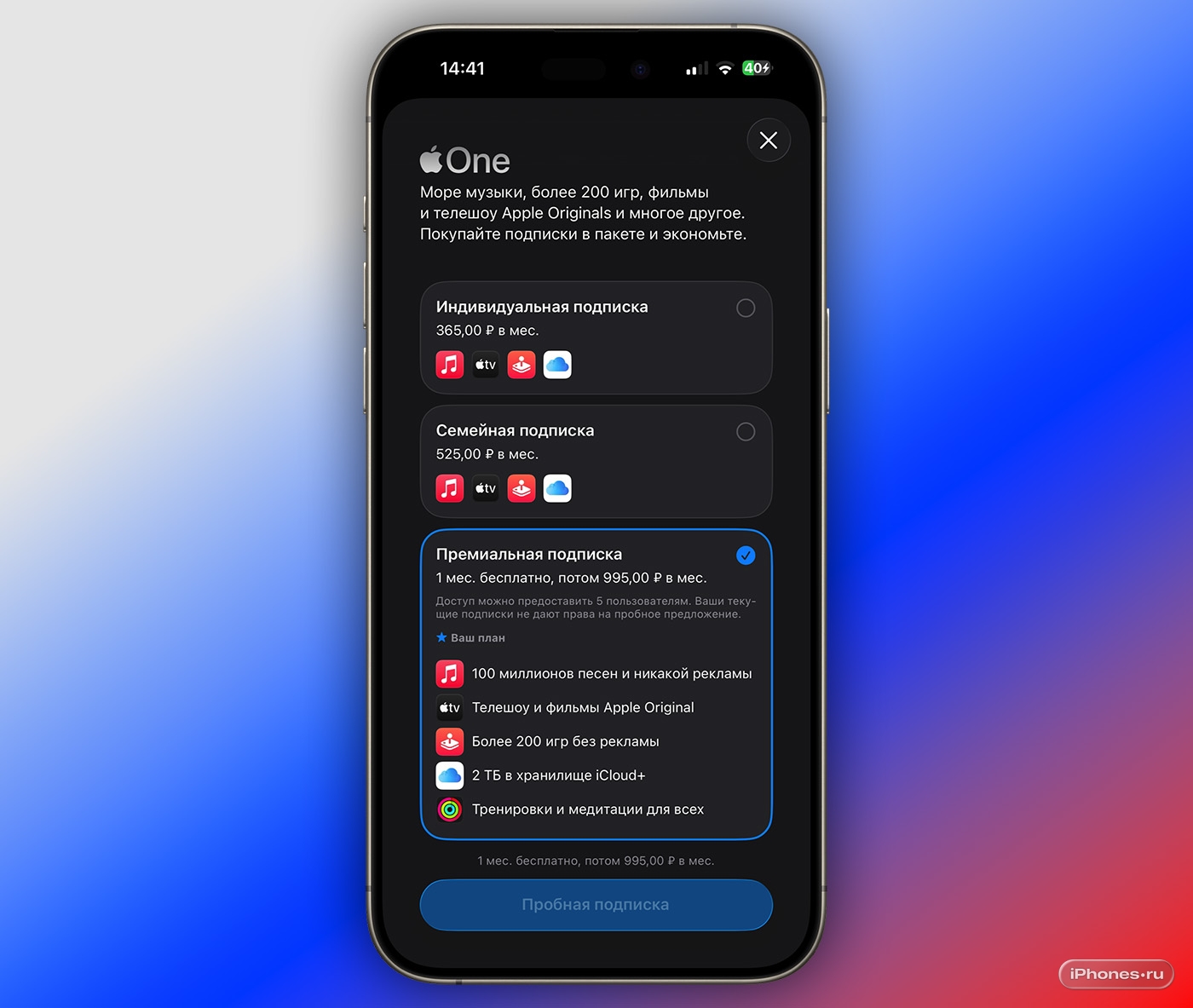 - Apple One премиальная: 995 руб. → 1190 руб.