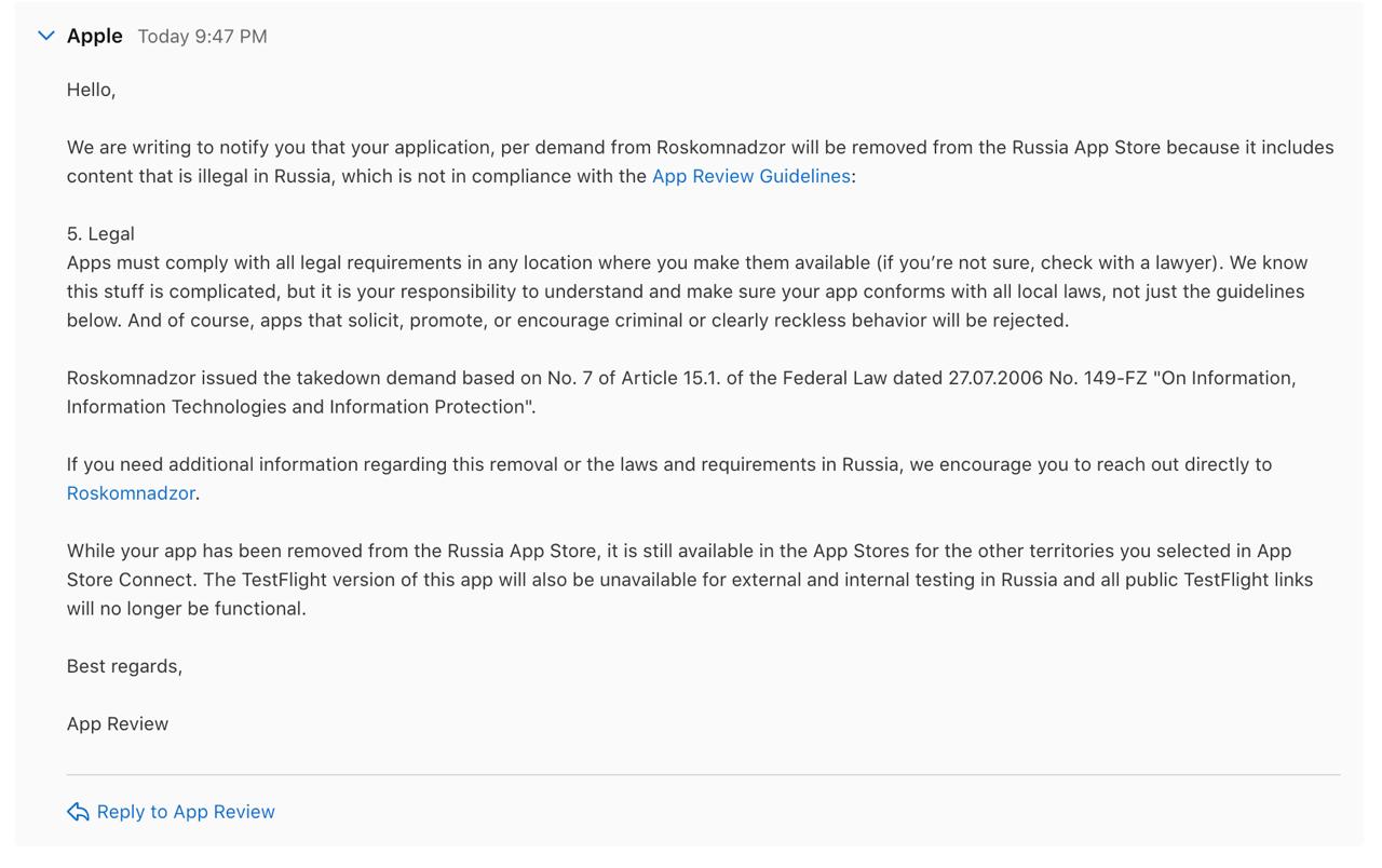 Удаление произошло по требованию Роскомнадзора. Разработчики v2RayTun опубликовали письмо от Apple, где указано, что приложение скрыто из российского App Store из-за «незаконного контента» по местному законодательству. [Код Дурова]