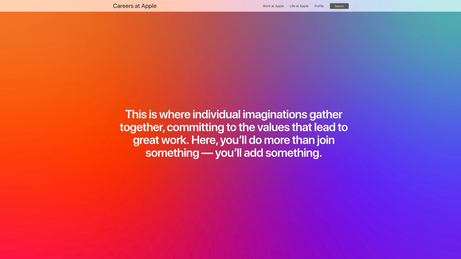 На нем представлены доступные профессии, отзывы сотрудников, короткие видеопрезентации, гайды по работе в компании и многое другое. Сайт поделён на две части: «Работа в Apple» и «Жизнь в Apple».