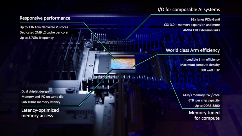 AGI CPU выполнен по 3-нм техпроцессу и включает до 136 ядер Neoverse V3. Заявленный TDP — 300 Вт. Пропускная способность памяти достигает 6 ГБ/с на ядро при задержке менее 100 нс. Поддерживается до 6 ТБ оперативной памяти и стандарт DDR5-8800.