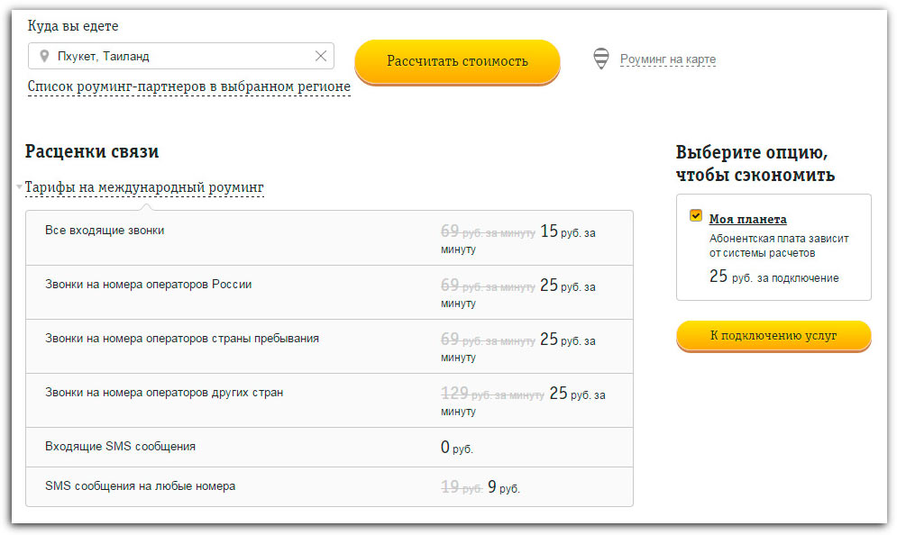 Наиболее выгодна в этом плане услуга «Моя планета», которая в разы поможет снизить расходы на звонки за границей. Стоимость подключения составляет 25 рублей. Причем данная опция предоставляется без абонентской платы. То есть достаточно подключить ее один раз и пользоваться всегда в любой стране по принципу «подключил и забыл». Услуга действует более чем в восьми десятках стран. Самые выгодные условия на звонки и SMS с этой услугой действуют практически в тех же странах, что и выгодный интернет. Минута входящих вызовов с подключенной услугой обойдется в 15 руб., исходящих — 25 руб. (вызовы в Россию, внутри страны пребывания и другие страны международного роуминга). Каждое исходящее сообщение SMS стоит 9 руб. Список стран можно найти на официальном сайте оператора. Чтобы понимать выгоду от данного предложения, допустим, во время пребывания в Таиланде, стоит сравнить его с базовыми тарифами: