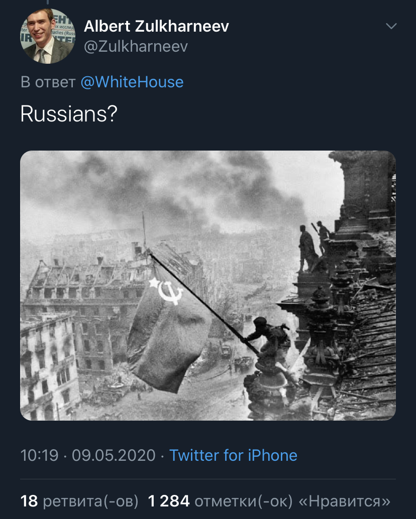 Многие юзеры даже опубликовали знаменитое фото, где Михаил Егоров и Мелитон Кантария водрузили флаг СССР над Рейхстагом . Кто-то в шутку даже перекрасил флаг в американский.