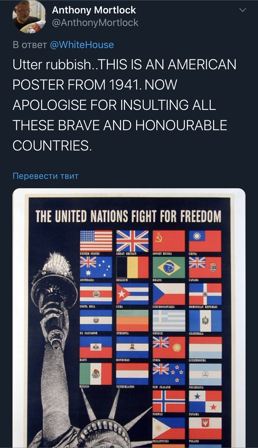 Администрация президента США опубликовала в своём Instagram-аккаунте запись, в которой говорится, что они и Великобритания победили фашистов во времена Второй Мировой войны.