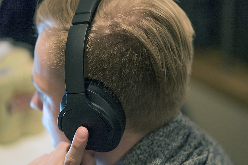 На левой чашке есть сенсорная панель: касаясь её пальцем, можно приостановить или возобновить воспроизведение трека, регулировать громкость и перематывать песни.