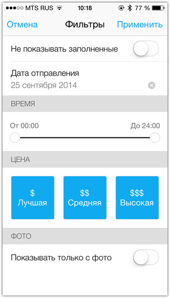 Сразу после регистрации можно начинать искать маршрут – или добавлять свой (если вы будете водителем). Процесс поиска напоминает заказ такси. Вы задаёте точку отправления из списка или на карте, затем указываете точку прибытия. Плюс желаемое время. Всё остальное за вас, потенциального пассажира, программа сделает сама. Указываете из какого пункта в какой вы хотите добраться, и система показывает вам список предложений от водителей, которые едут по этому маршруту и готовы вас подвезти. Список можно отфильтровать по нужным вам параметрам: дата, время, цена и т.п. К тому же можно подписаться на маршрут и получать уведомления при каждом новом предложении – очень удобно, если существующие варианты вас не устраивают или их нет вовсе.