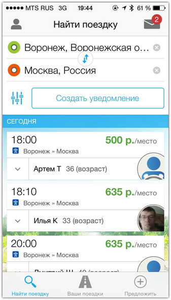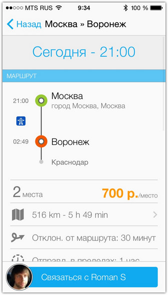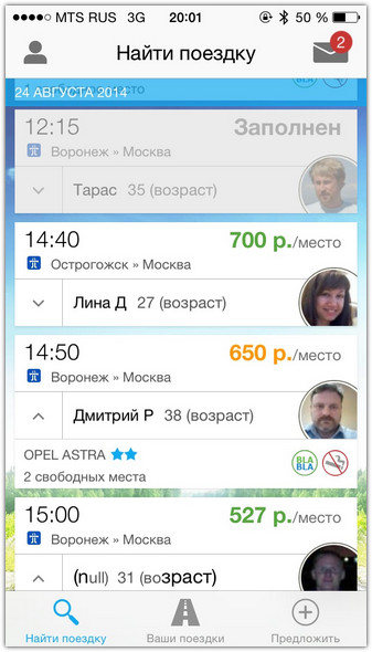Скорее всего, вам выпадет широкий выбор вариантов. Чем популярнее маршрут и чем ближе он к крупным дорогам страны, тем больше предложений вы обнаружите. Остаётся только выбрать какое-нибудь одно. Для этого на экране результатов поиска отображены краткие параметры каждого предложенного маршрута: финальная цена за место, прогнозируемое время посадки, имя водителя, его фото, возраст и марка автомобиля.