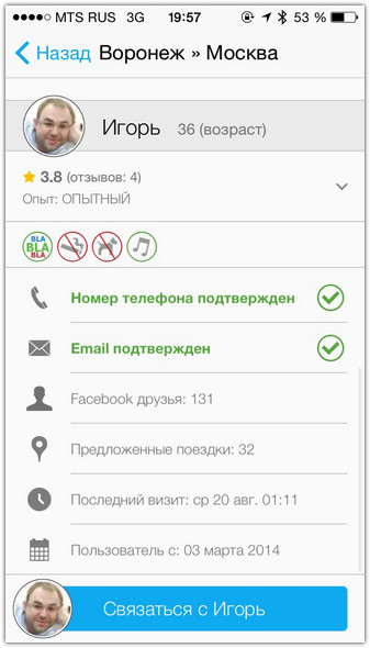 Ещё ниже – самая главная информация для пассажира. Во-первых, автомобиль. Водители указывают уровень комфорта в машине и часто публикуют её настоящую фотографию. Это позволяет подобрать вариант под свои предпочтения и удобства. Во-вторых, здесь же отображаются отзывы других попутчиков и опыт водителя – грубо говоря, количество поездок, которые он завершил вместе с BlaBlaCar. В-третьих, круглыми пиктограммами отмечены его же предпочтения: то, как много он готов болтать, можно ли курить в машине, брать животных и управлять музыкой, играющей из колонок в авто.