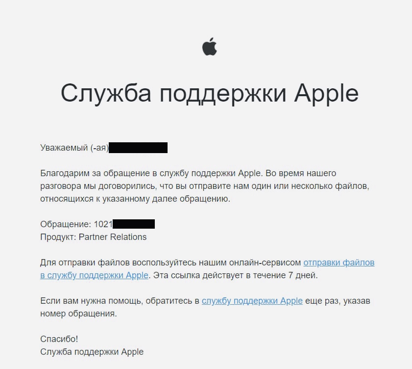 Письмо от Apple с просьбой отправить необходимые документы