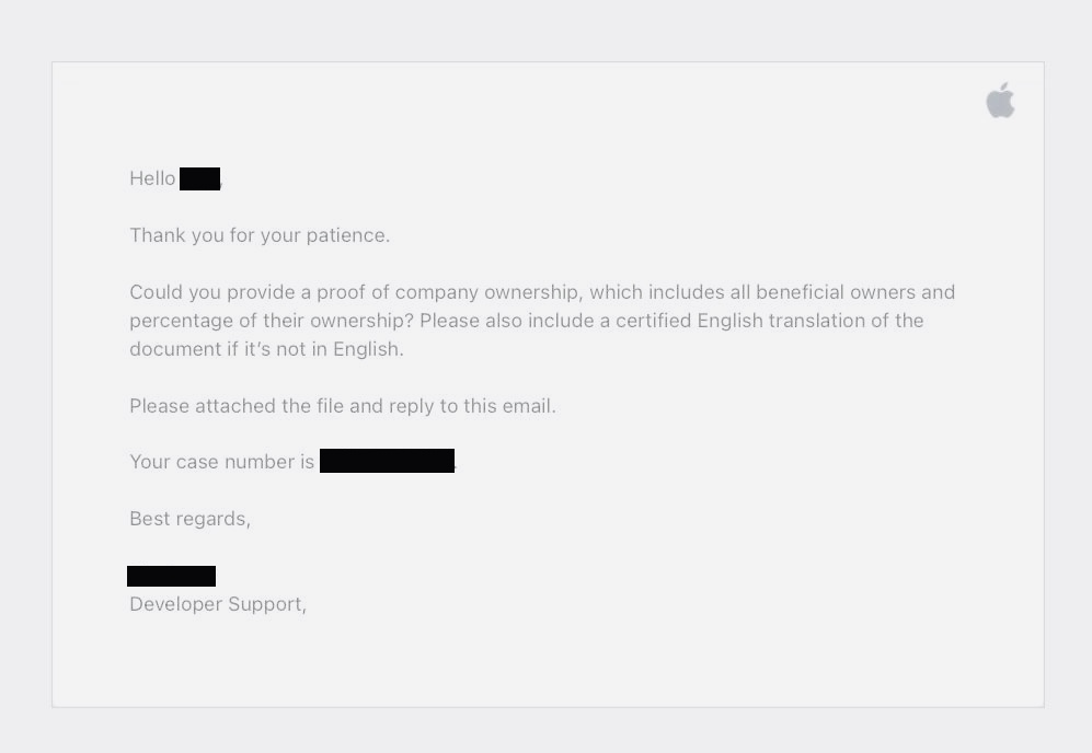Письмо от Apple с просьбой подтвердить деятельность компании