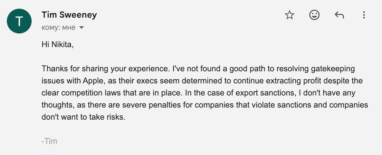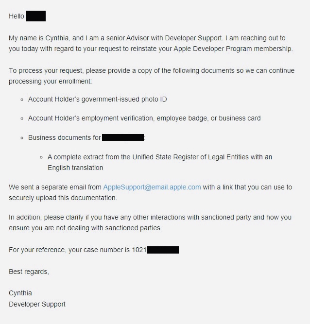 Разработчик может общаться c Apple в формате переписки с поддержкой, а можно обращаться сразу с юридического запроса и пакета документов на проверку. Во многих случаях российские разработчики сразу поступают по второму варианту, но всё равно упираются в молчание и формальный отказ.