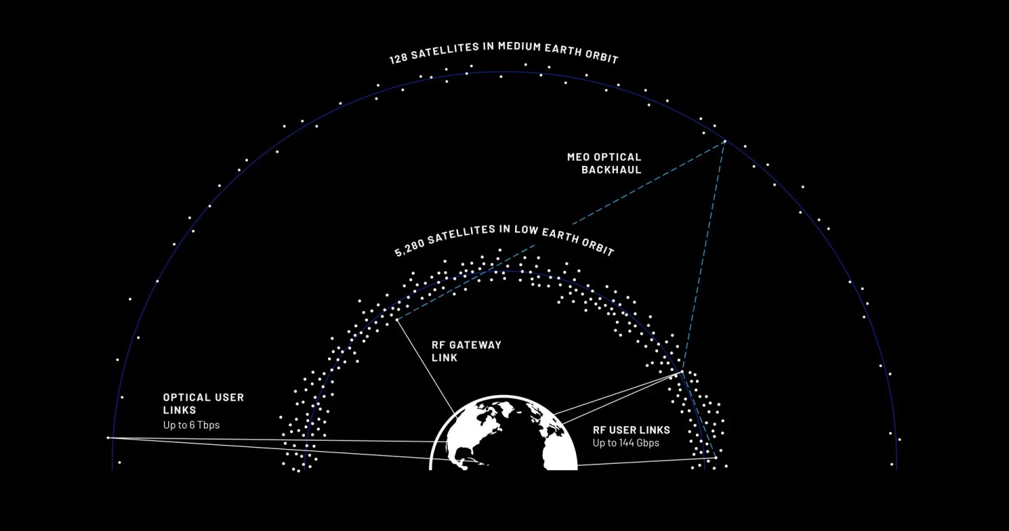Сеть Blue Origin имеет многоорбитальную конструкцию, состоящую из 5280 спутников, расположенных на низкой околоземной орбите. Они будут обеспечивать скорость до 144 Гбит/с.