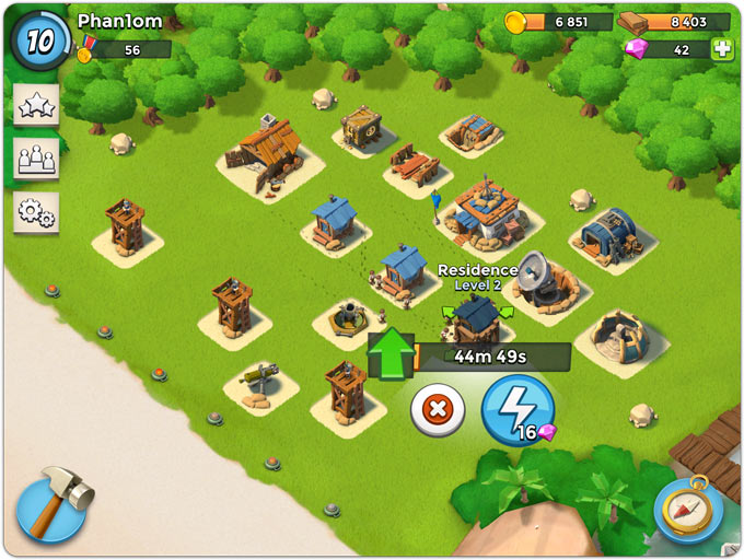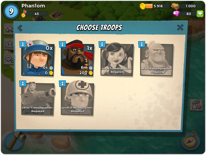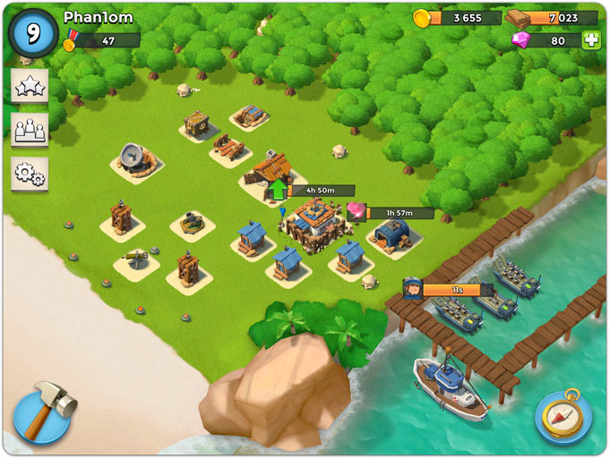 Начнем знакомство с Boom Beach с собственного острова, который и станет центром нашей деятельности. Здесь мы можем строить здания, готовить войска и укреплять оборону. Центром нашей базы является штаб-квартира, безопасность которой стоит превыше всего. Кроме строительства, здания также можно улучшать. Большинство новых построек, юнитов и улучшений станут доступны после улучшения главного здания. На любое действие, разумеется, требуется реальное время и определенный запас ресурсов.