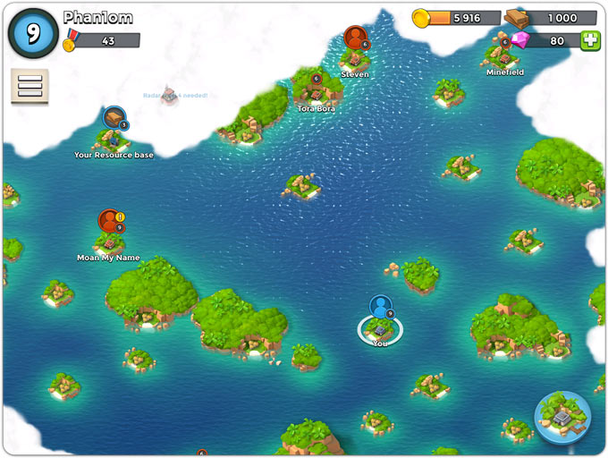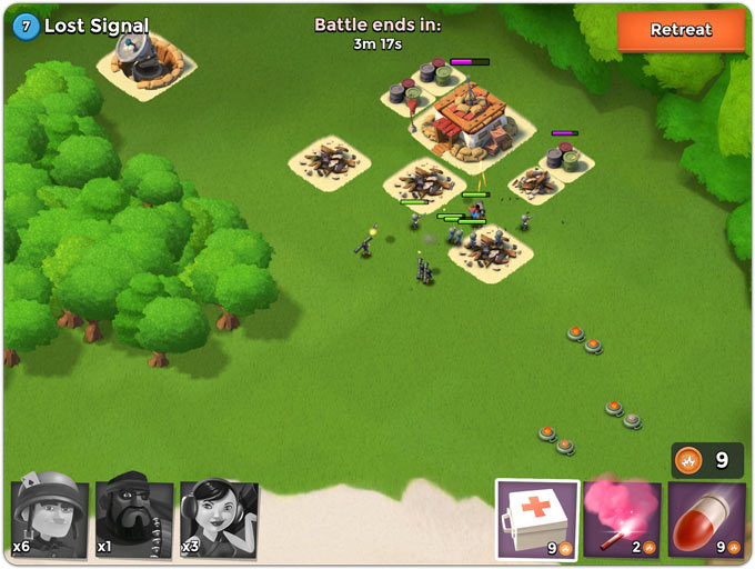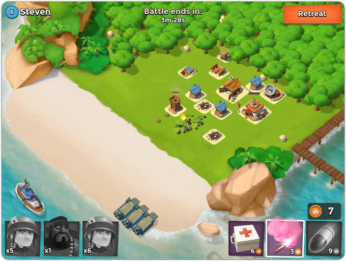 Если отбросить в сторону миссии против компьютерных оппонентов из Blackguard, схемы остров которых разработчики заложили в игру собственноручно, то на более высоких уровнях бороться нам предстоит уже с реальными игроками, которых Boom Beach случайным образом забрасывает в наши воды. При этом сами игроки зачастую даже не в курсе, что мы уже готовы напасть на них, как только они окажутся офлайн (здесь действует соответствующее ограничение). Так вот, организация обороны собственной базы и взлом вражеской – один из самых интересных элементов игры. Здесь как раз и идут в ход различные тактические хитрости и использование невозможности полноценно руководить войсками. По идее полет фантазии должен быть огромный, но на деле, если взглянуть на базы других игроков, то существует всего одна наиболее действенная схема, а сигнальные ракеты – это наше все.