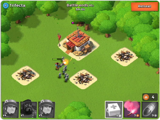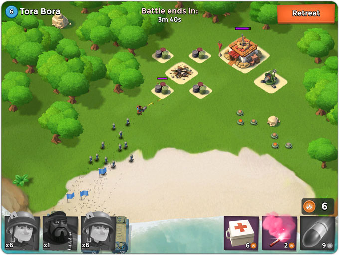 Пора отправляться в бой. На любого противника можно предварительно взглянуть в режиме разведки, чтобы затем начать операцию. На все про все отводится четыре минуты: за это время необходимо уничтожить штаб-квартиру противника. Разумеется, красную дорожку до главного здания стелить никто не будет. Как и у нас на базе, штаб-квартиру любого укрепления охраняют защитные сооружения: снайперские вышки, пулеметы, мортиры и многие-многие другие орудия, которые несут реальную угрозу нашим войскам, которыми мы, внимание, не управляем. Мы вольны указать для них точку высадки на берегу, а дальше они направятся к ближайшему зданию.