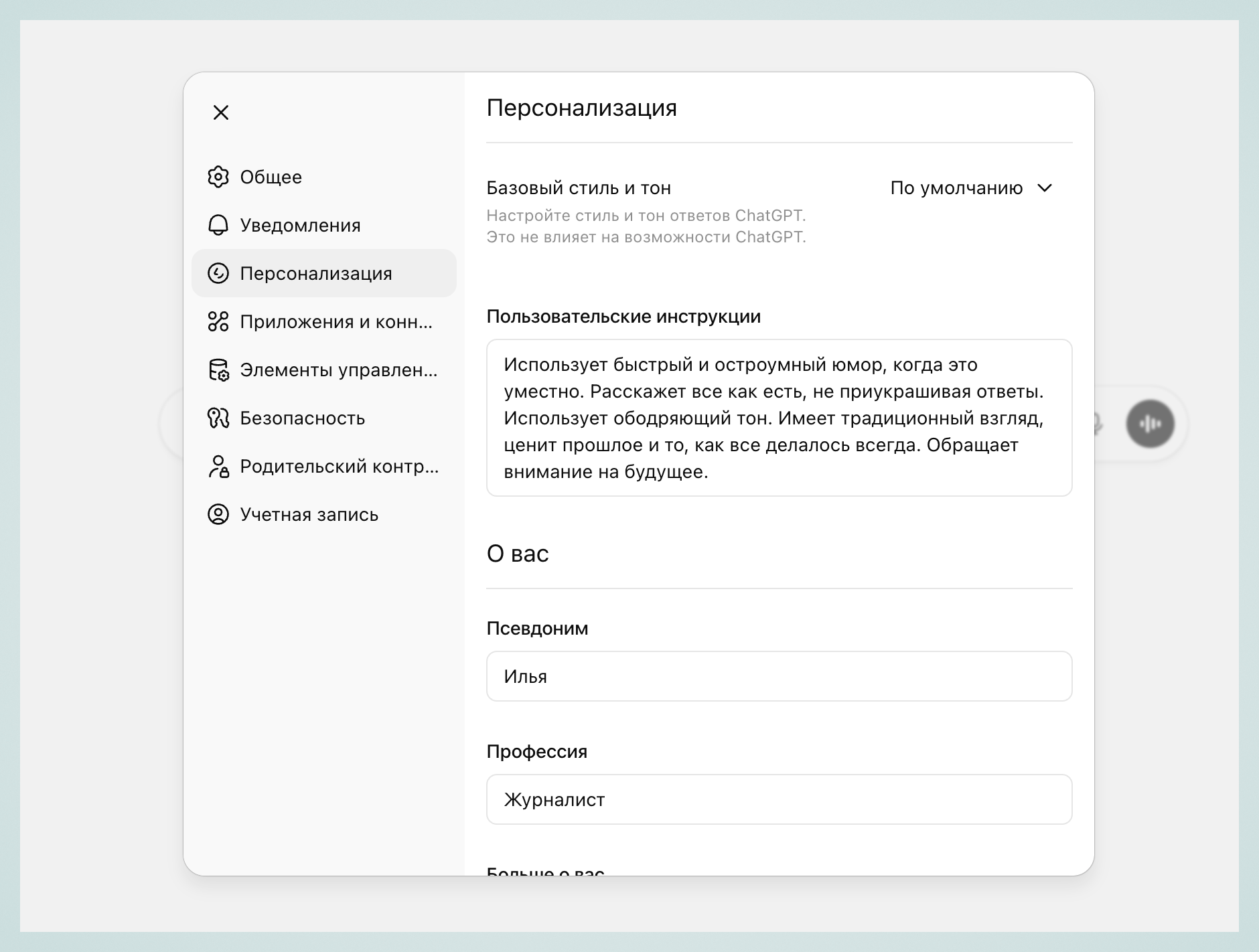 Также осталась возможность прописать свои инструкции для общения, указать имя, профессию и немного информации о себе, которую ИИ может использовать в общении.