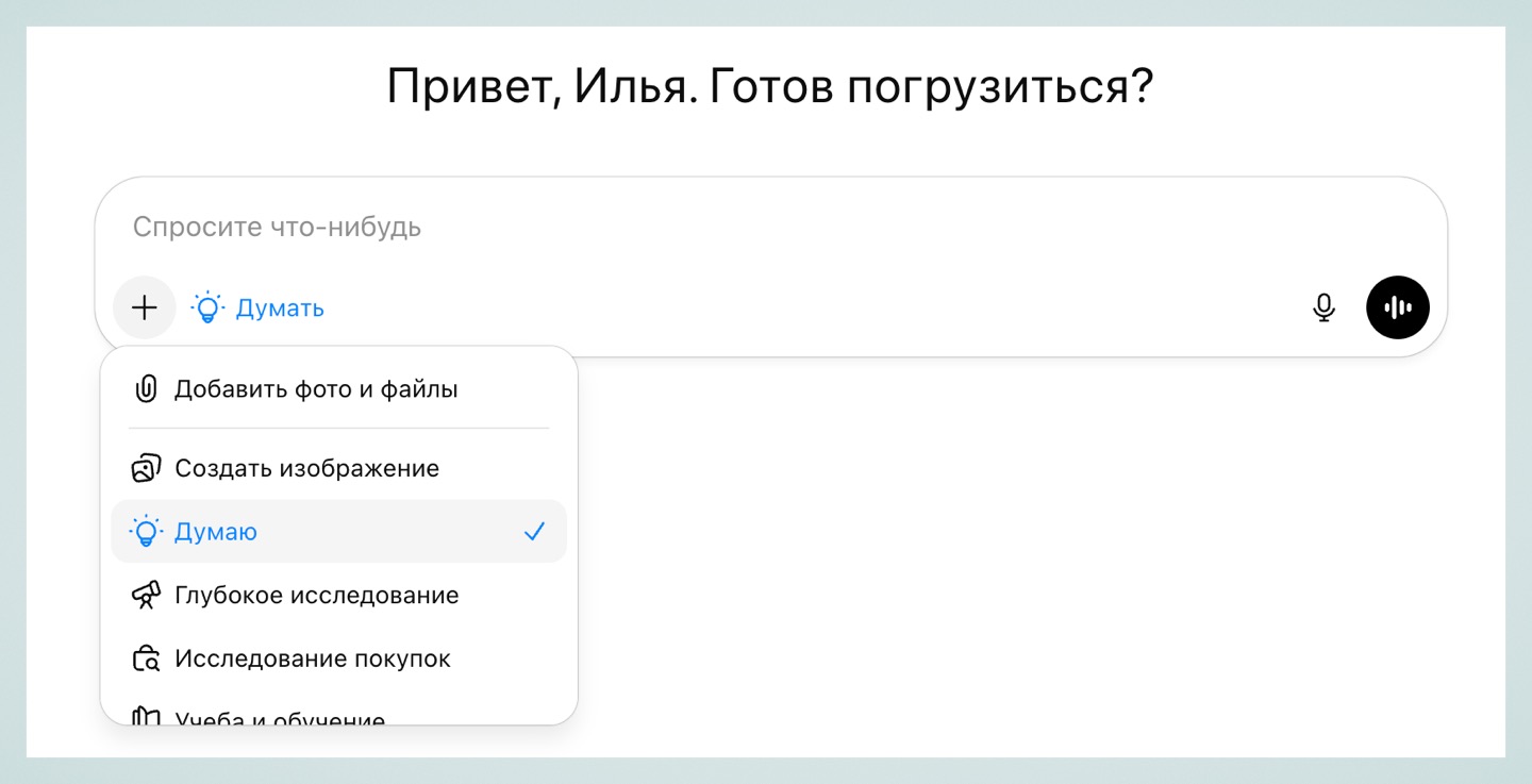Этот режим пригодится для ответа на сложные вопросы, которые состоят из нескольких шагов. Можно использовать в аналитике, программировании и просто при сложных задачах, когда вы хотите, чтобы ИИ подумал максимально хорошо.