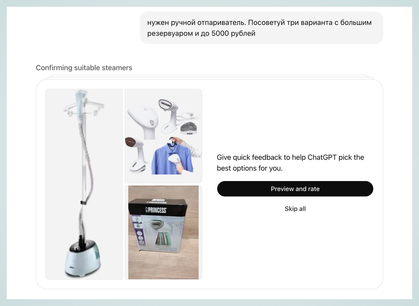 Например, если попросить его найти парогенератор, то ChatGPT задаст несколько уточняющих вопросов, а затем предложит варианты из магазинов. В конце он сгенерирует ответ, в котором подробно расскажет о плюсах и минусах каждой модели, а также выдаст цену и ссылку на покупку.