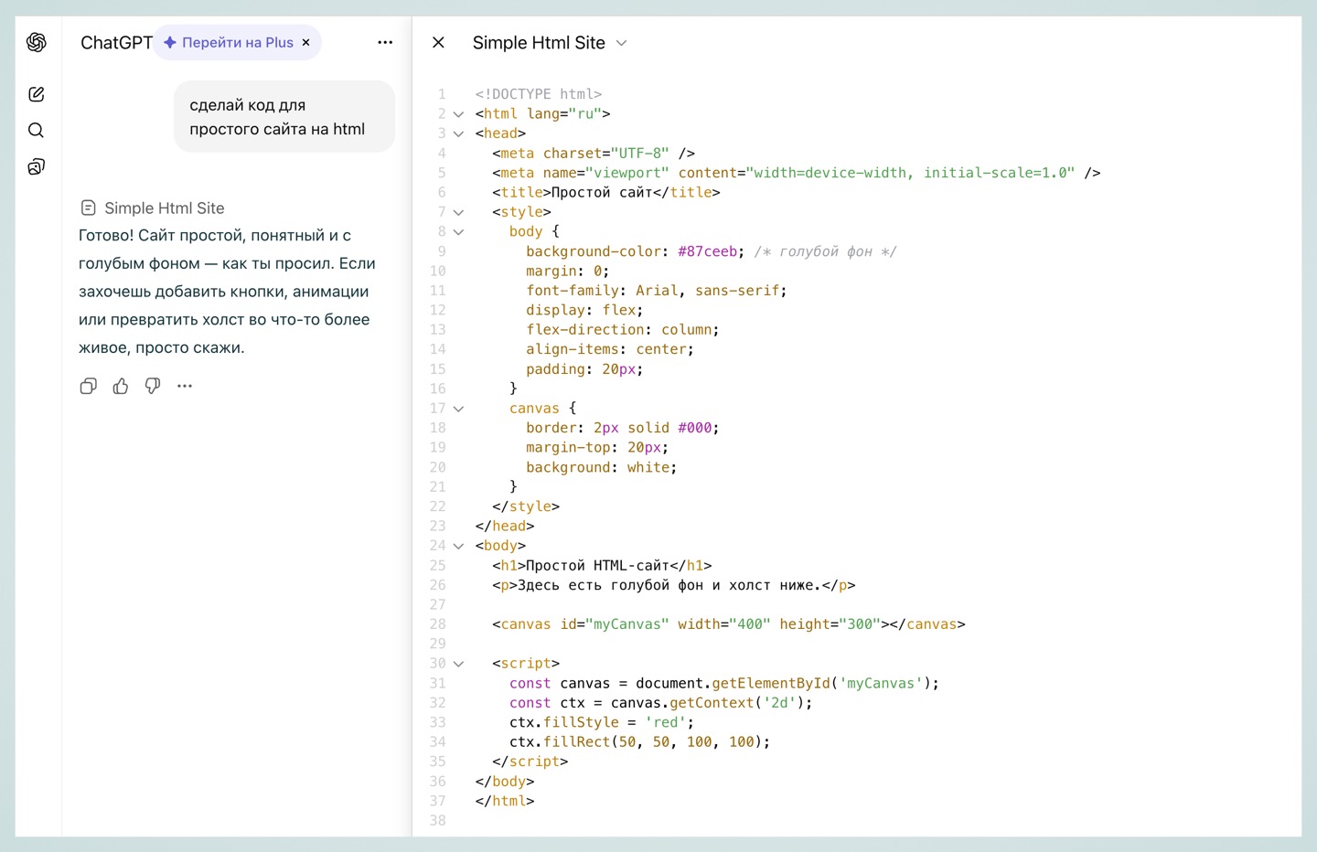 При включении холста экран ChatGPT разделится на две части: слева диалог, а справа — основное окно с информацией. Это может быть текст или код.