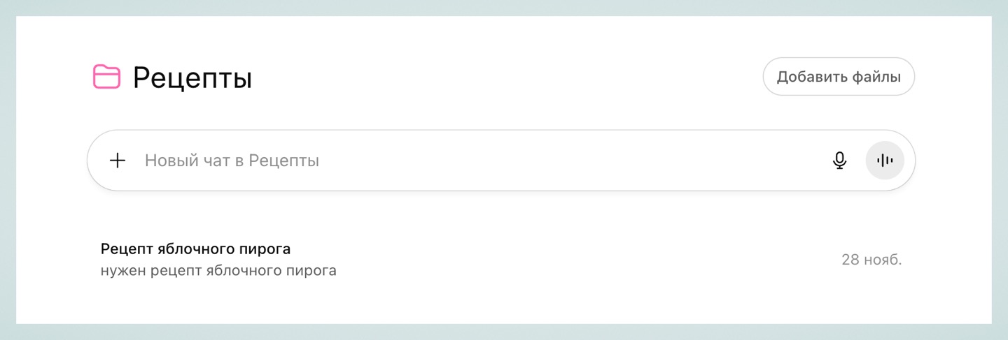 Кроме того, проекты можно использовать как хранилище диалогов на определённые темы. К примеру, если вы часто обсуждаете рецепты с ChatGPT, то можно сделать проект «Рецепты».