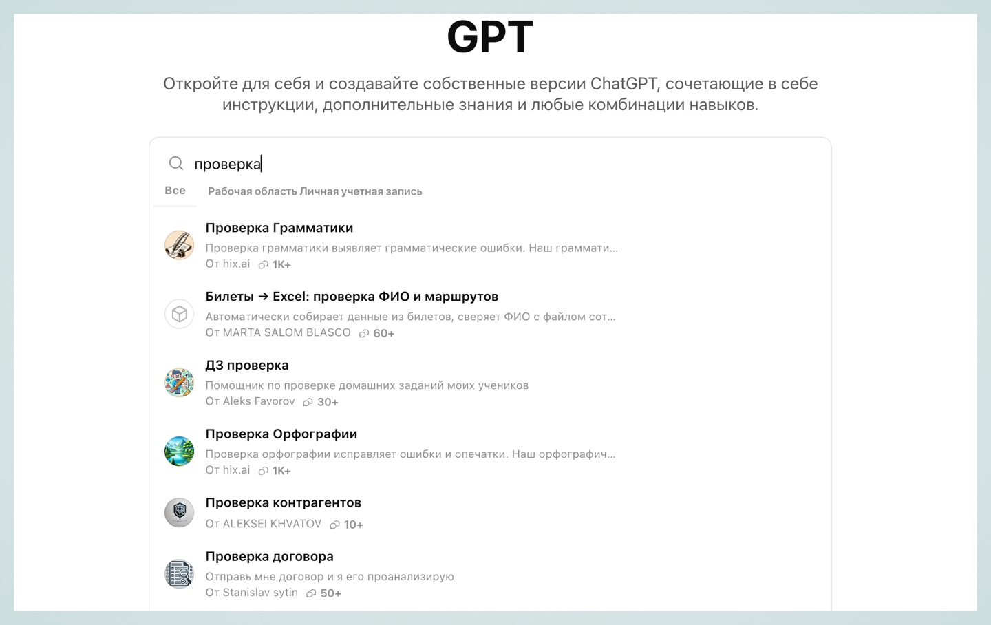 Есть боты для проверки грамматики, домашних заданий, договоров, а также генераторы логотипов, иконок и промтов. На самом деле список кастомных GPT намного больше, я лишь привёл несколько примеров.