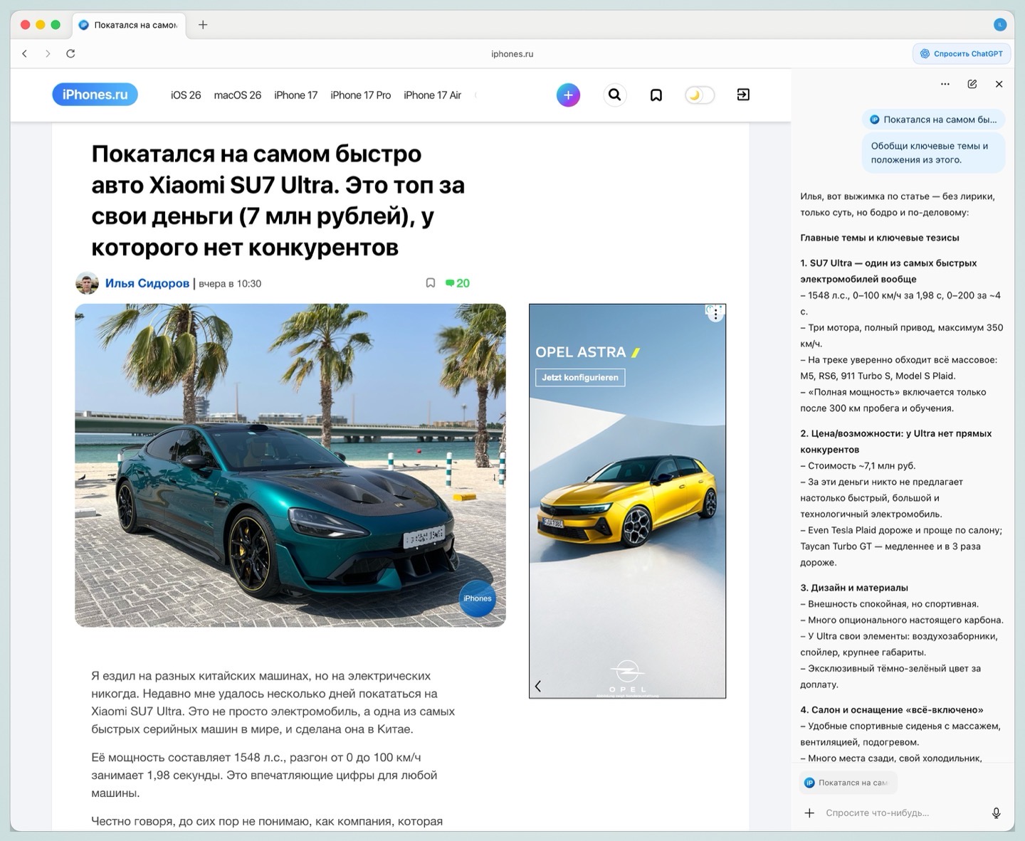 Этот браузер использует ChatGPT в качестве поиска по умолчанию. Также он может создавать краткие сводки сайтов и отвечать на вопросы, основываясь на информации на странице.