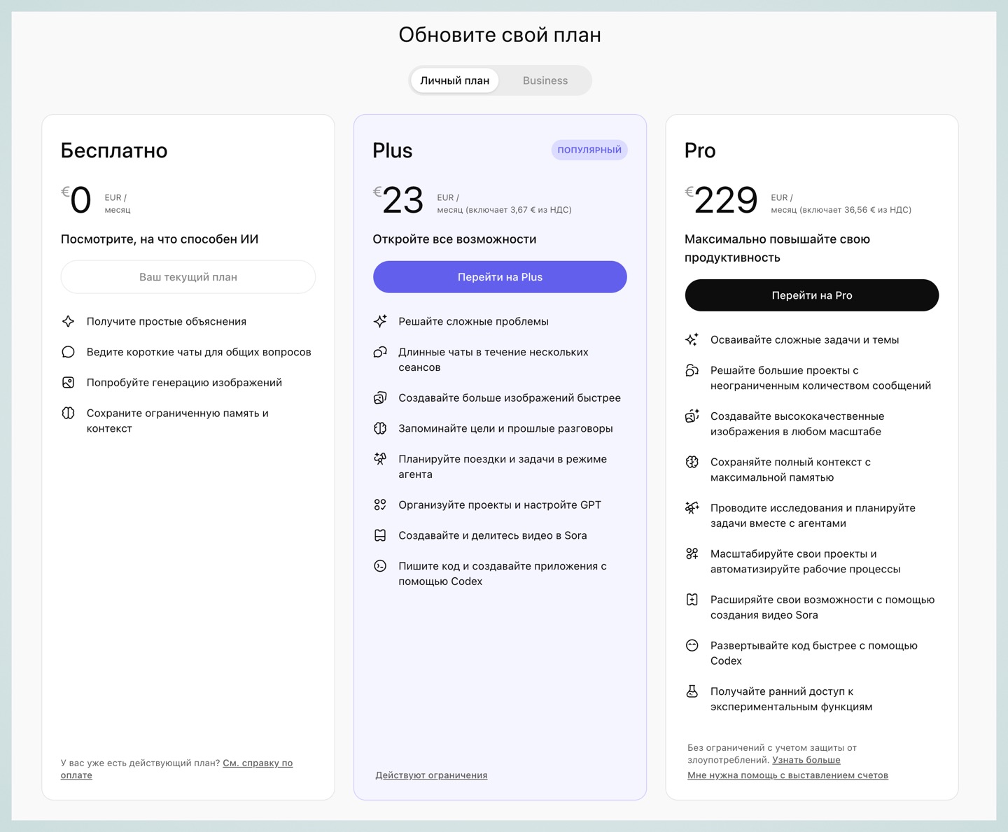 OpenAI предлагает большой набор платных подписок, но нас интересует только Plus. Это самая дешёвая и популярная подписка.