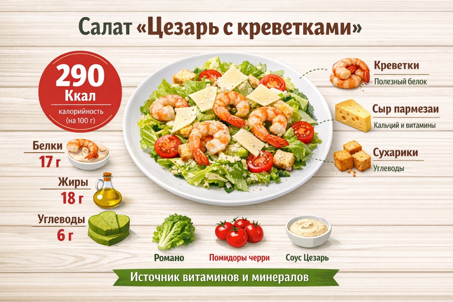 Промт: Сделай инфографику на русском языке калорийности салата «Цезарь с креветками». Соотношение 4:3.