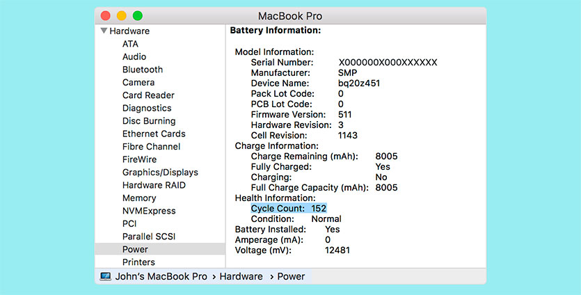 Диагностика батареи MacBook начинается с определения количества циклов заряда. В отличие от iOS, macOS не скрывает эту информацию.