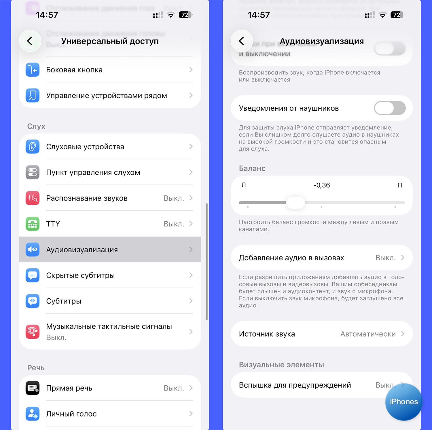 Перейдите в Настройки – Универсальный доступ – Аудиовизуализация и сместите баланс в нужную сторону.