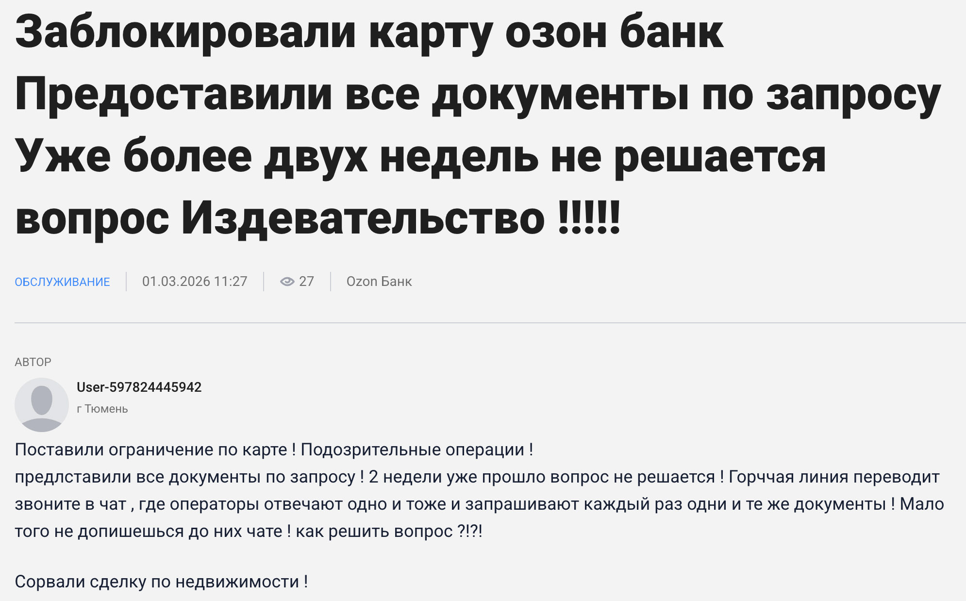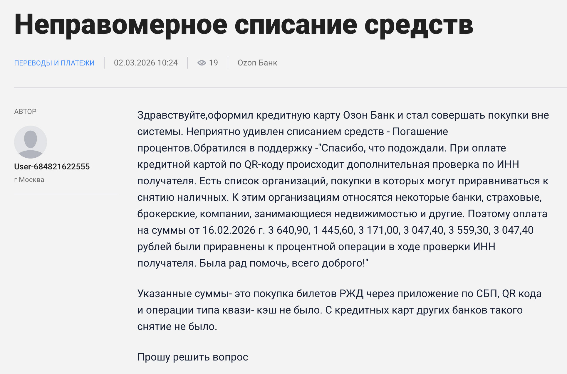 Ozon Банк, который еще недавно агрессивно захватывал рынок своими скидками и пластиком за 1 рубль, столкнулся с кризисом доверия. В начале 2026 года форумы и соцсети заполнили жалобы на условия обслуживания и кредитования.