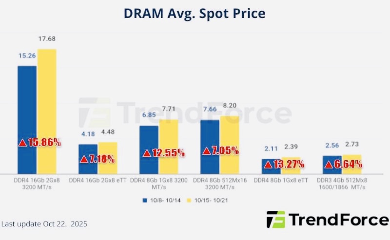 TrendForce несколько раз обновляло прогнозы на оптовые цены во второй половине 2025 года. Их повышение по DDR5 раньше ожидалось на уровне 8–13%, но теперь прогнозы увеличил до 18–23%.