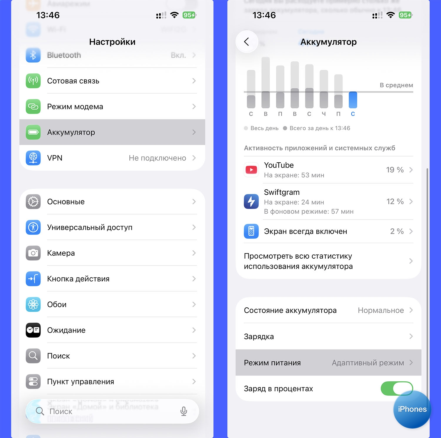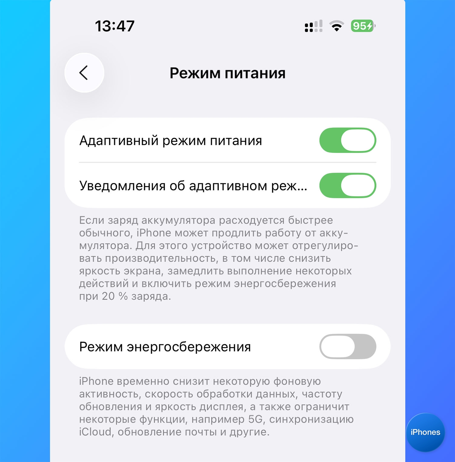 Адаптивный режим питания (Adaptive Power) – новая функция iOS 26. Он работает в фоновом режиме, экономит заряд аккумулятора и помогает Айфону дольше продержаться без подзарядки.