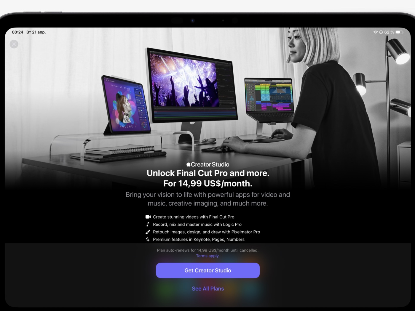 Также здесь доступна Apple Creator Studio, которая открывает доступ к незаменимому приложению Pixelmator Pro на iPad для векторной и растровой обработке изображений.