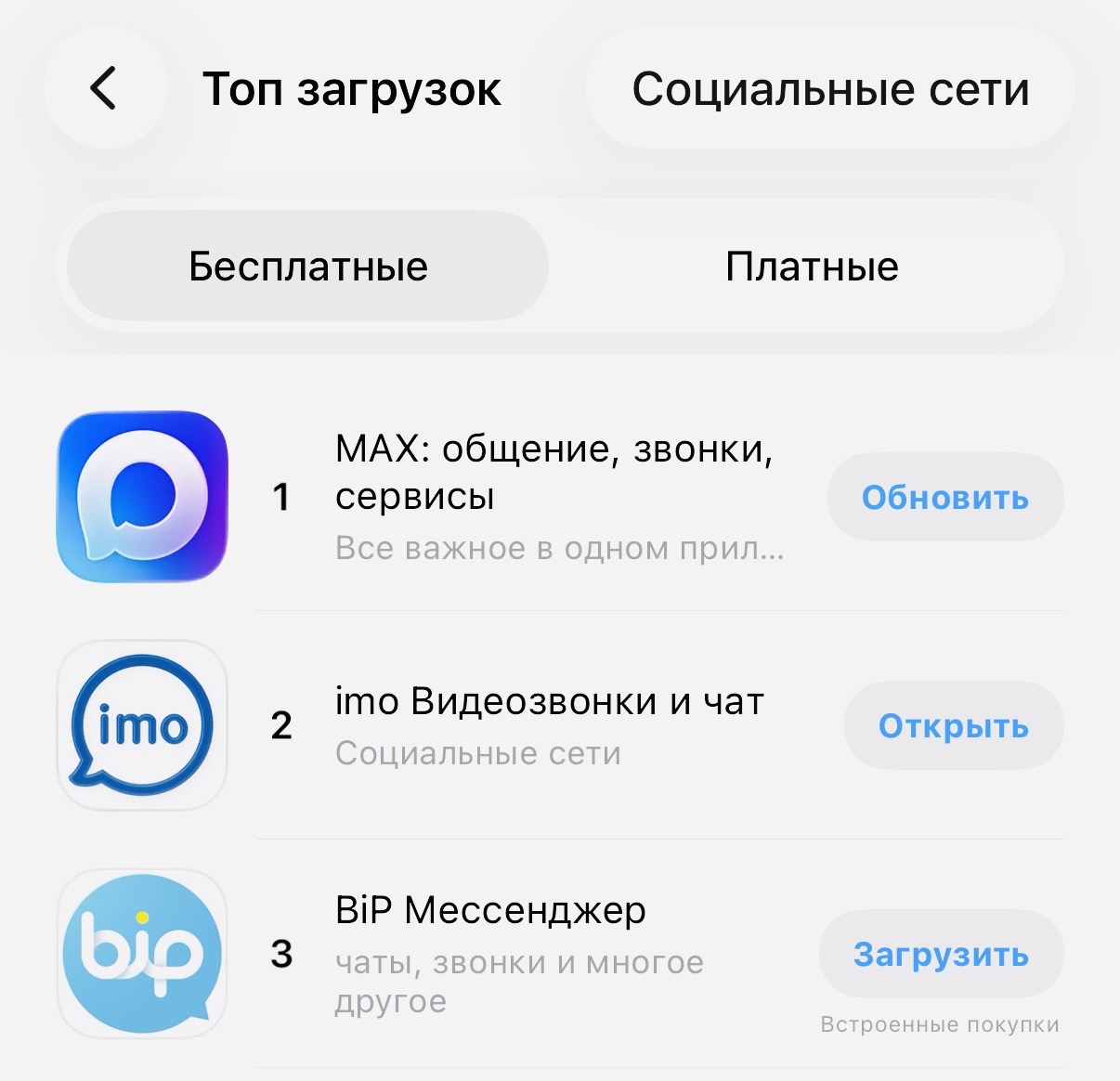 На этом фоне в сети активно набирает популярность новый мессенджер imo (iOS, Android). Еще неделю назад он попадал в десятку активно используемых в России, а уже сегодня он занимает второе место в App Store, уступая только MAX.