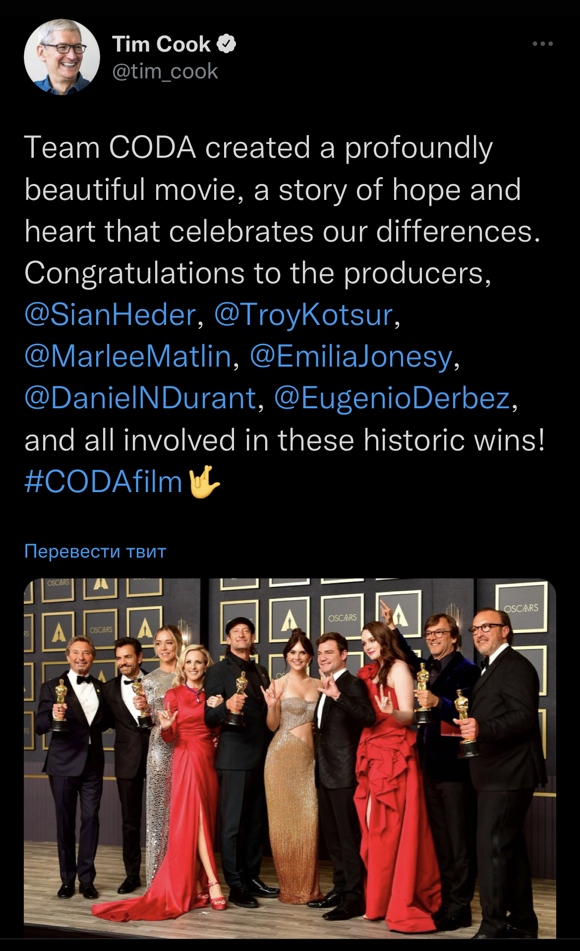 Перевод: Команда CODA создала очень красивый фильм, историю надежды и сердца, воспевающую наши различия. Поздравляем производителей @SianHeder , @TroyKotsur , @MarleeMatlin , @EmiliaJonesy , @DanielNDurant , @EugenioDerbez и всех, кто причастен к этим историческим победам! #CODAfilm